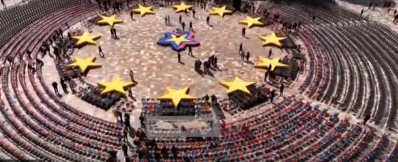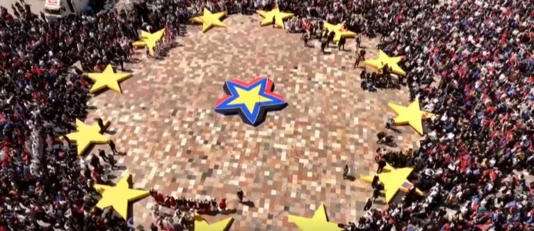 TIRANË– Teksa akrepat e orës kanë kaluar orarin e njoftuar 12:00 për çeljen  fushatës zgjedhore, nga pamjet e publikuara shihet qendra e sheshit Skëndërbej ku janë vendosur 12 yje në formë rrethore, që simbolizojnë 12 yjet e flamurit të Bashkimit Europian.