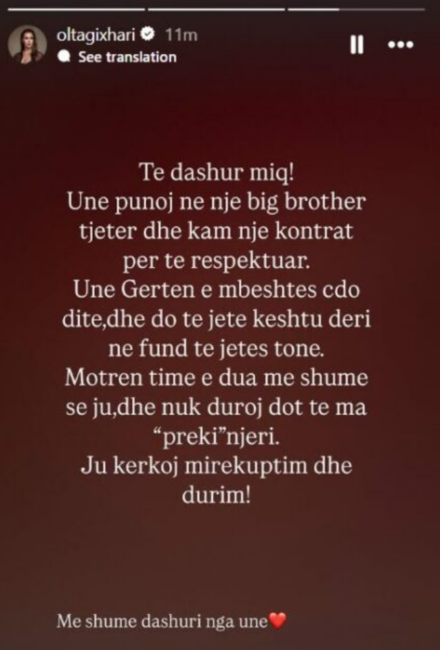 Në një instastory, Olta Gixhari ka sqaruar njëherë e mirë që ka një marrëdhënie shumë të mirë me Gerten.