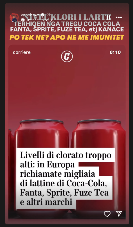 Në një postim në rrjetet sociale Braçe shkruan: “Nivel klori i lartë. Tërhiqen nga tregu Coca Cola, Fanta, Sprite, Fuze Tea etj kanaçe.