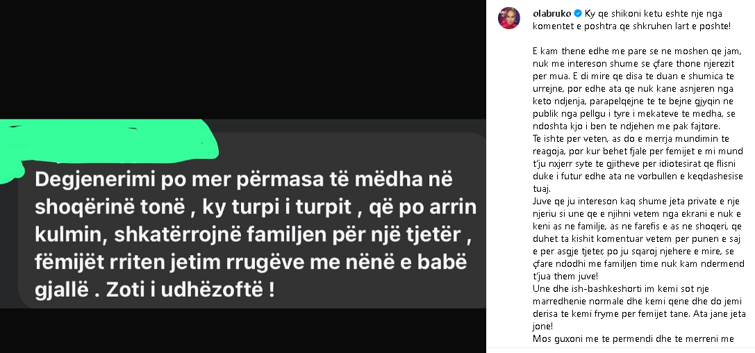 Gazetarja dhe moderatorja Ola Bruko, pak ditë pasi bëri publike zyrtarisht lidhjen e dashurisë me këngëtarin Endri Prifti, ka reaguar ashpër për disa komente fyese dhe aspak etike në rrjet, që prekin fëmijët e saj, nga martesa e parë e dështuar.
