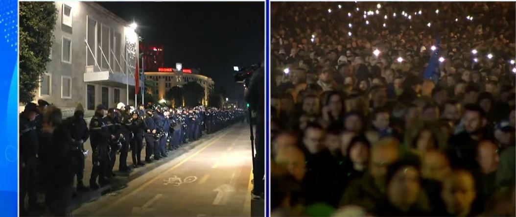 TIRANË– Kreu i PD-së, Sali Berisha është ngjitur në podium për të mbajtur fjalën e tij në protestën e opozitës, ndërsa teksa qytetarët që kanë marrë pjesë në tubim kan ë hedhur kapsolle dhe tymuese.
