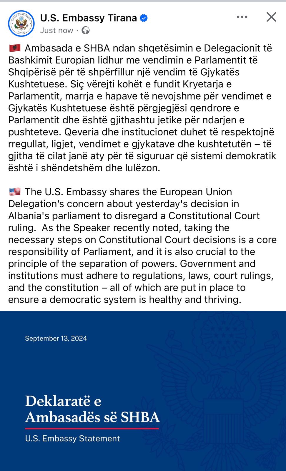 Ambasada e SHBA ndan shqetësimin e Delegacionit të Bashkimit Europian lidhur me vendimin e Parlamentit të Shqipërisë për të shpërfillur një vendim të Gjykatës Kushtetuese.