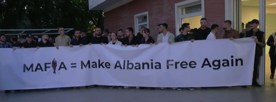 “Make Albania Free Again”, kjo është pankarta e vendosur përpara derës së selisë së PD.