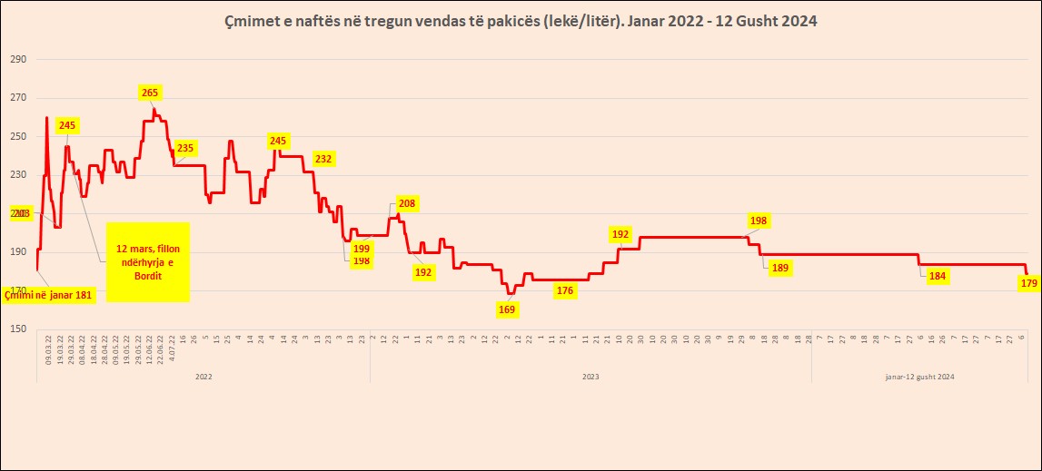 Në pikat e tregtimit të Kastrati, më i madhi në vend si për shumicën, ashtu dhe pakicën, nafta po tregtohet me 179 lekë për litër, nga 184 lekë për litër që ishte më parë. Eida petroleum e tregton karburantin me 177 lekë/litër.
