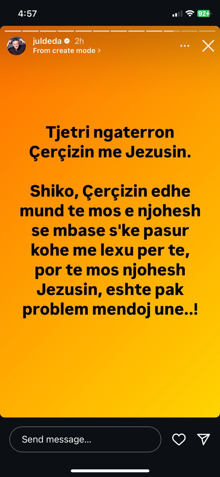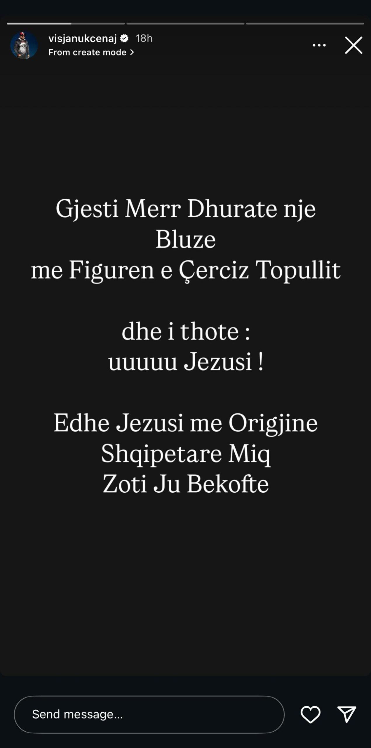 Visjan Uckenaj nëpërmjet një Instastory kritikoi Gjestin i cili për Çerçiz Topullin u shpreh se është Jezu Krishti.