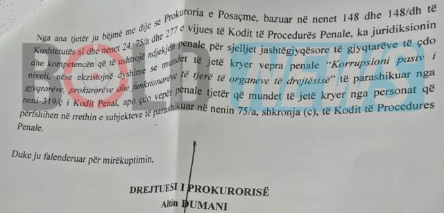Por më tej Dumani i drejtohet Zaçajt- “në përgjigje të interesit Tuaj, mund t’Ju konfirmojnë se në Prokurorinë e Posaçme nuk është paraqitur asnjë kallëzim penal ndaj ndonjërit prej anëtarëve të Gjykatës Kushtetuese, si edhe ju konfirmojmë se nuk është në statusin ‘person nën hetim’ asnjë prej gjyqtarëve kushtetues”.