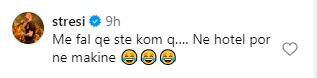 Nuk ka vonuar reagimi i Stresit pas asaj që tha Juliana, ndërsa ka postuar foton e saj në InstaStory, Stresi shkruan: Më fal që s’të kam çu në hotel, por në makinë, në malin e Dajtit.