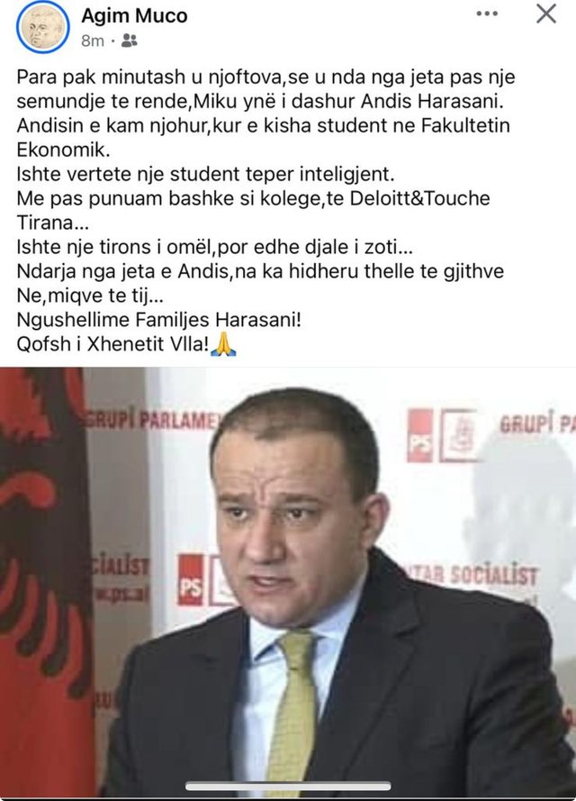 Lajmin e trishtë e ka bërë public në rrjete sociale një mik i tij Agim Muco, i cili shkruan: “Para pak minutash u njoftova se u nda nga jeta pas një sëmundje të rëndë, Andis Harasani. Andisin e kam njohur kur e kisha student në Fakultetin Ekonomik. Ishte vërtetë një student inteligjent. Më pas punuam bashkë te Deloitte&Touche Tirana. Ishte një tirons i omël por dhe djal i zoti.”