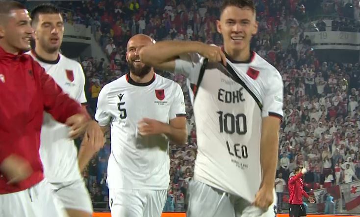 Kristjan Asllani me supergolin e tij i dha tri pikë Kombëtares në Gjeorgji. Pas golit, Asllani shpalosi fanellën që kishte veshur poshtë ku ishte dedikimi për ditëlindjen e të vëllait, Leonardos. “Edhe 100 Leo”, shkruhet në bluzë. Asllani edhe 100 leo gjeorgji gol