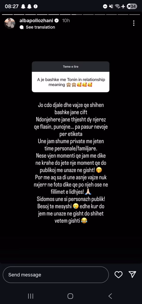 “Jo çdo djalë dhe vajzë që shihen bashkë janë çift. Ndonjëherë janë thjesht dy njerëz që flasin, punojnë… pa pasur nevojë për etiketa,” është shprehur ajo, duke i dhënë fund aludimeve që kishin nisur në rrjetet sociale.