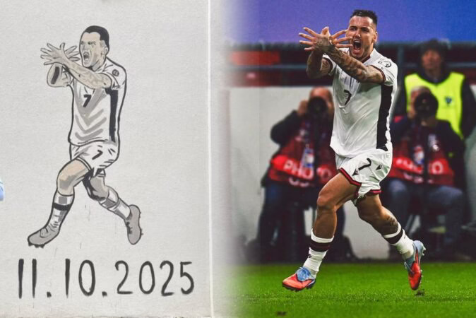 Artistët vendas kanë zgjedhur momentin e festës me shqiponjë për të nderuar sulmuesin kuqezi, që i dhuroi shqiptarëve emocionin e paharrueshëm të fitores.