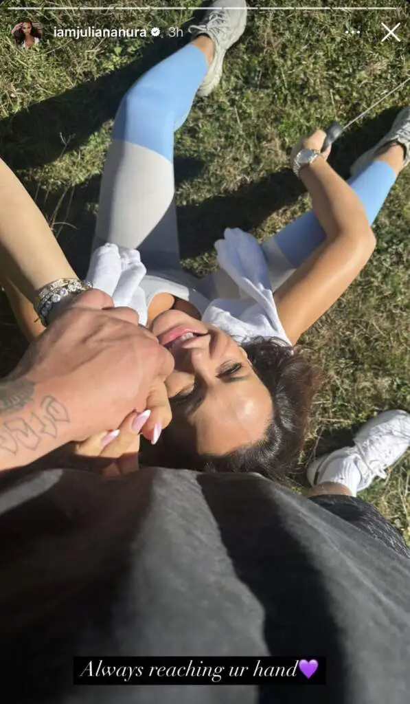 Nëpërmjet një postimi në “Instastory” Juliana shfaqet e ulur në natyrë, teksa shihet me duar të shtrënguara me një burrë me tatuazhe.