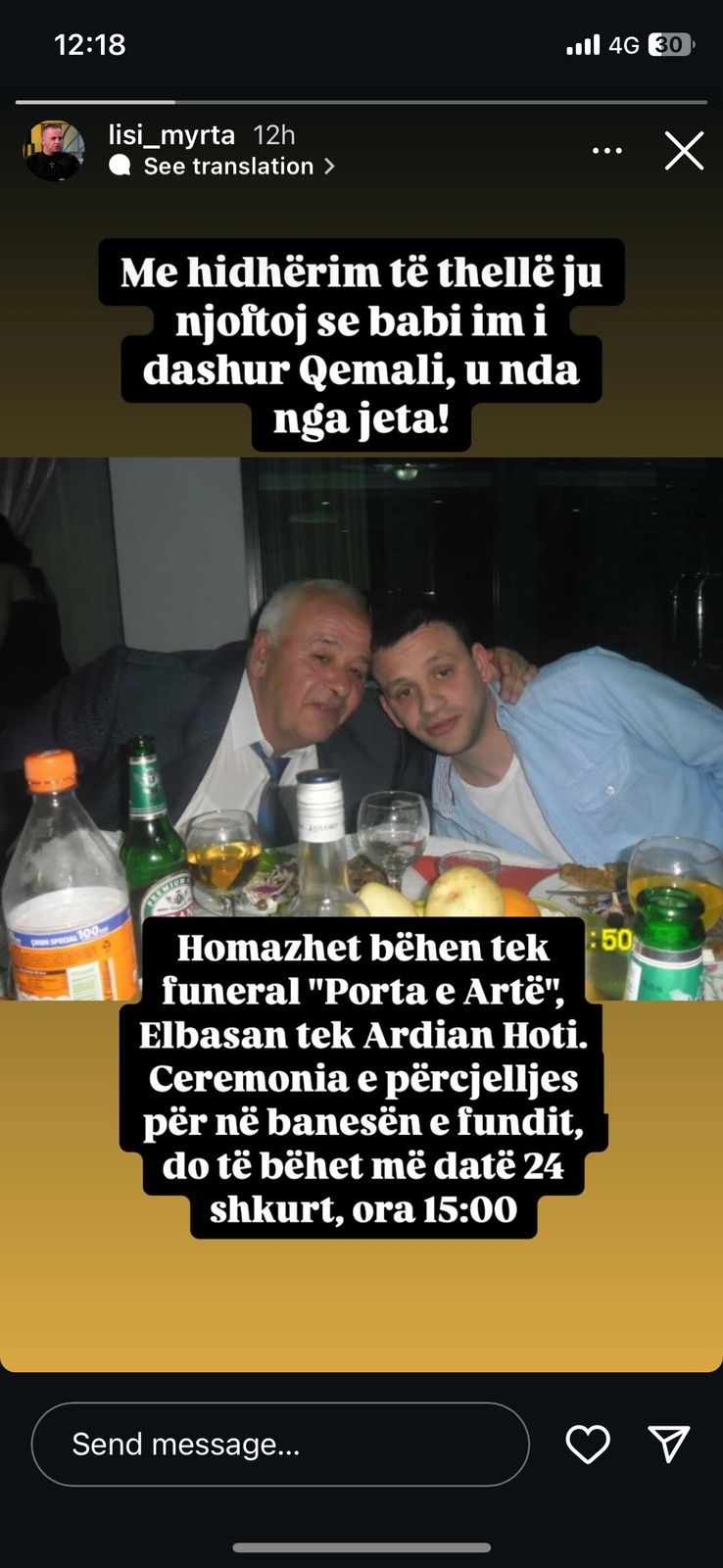 Nëpërmjet një Instrastory të postuar në profilin e tij në Instagram , gazetari teksa postoi një foto ku shfaqet ai krah babit të tij shkroi: Me hidhërim të thellë ju njoftoj se babai im i dashur Qemali, u nda nga jeta. Homazhet bëhen tek funerqal “Porta e Artë” Elbasan tek Ardian Hoti. Ceremonia e përcjelljes për në banesën e fundit do të bëhet më 24 shkurt ora 15:00.