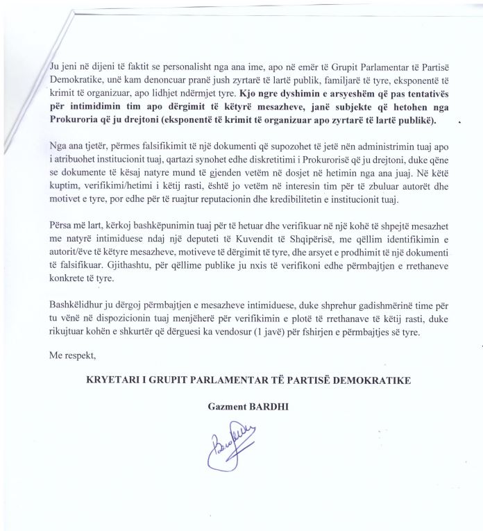Ju jeni në dijeni të faktit se personalisht nga ana ime, apo në emër të Grupit Parlamentar të Partisë Demokratike, unë kam denoncuar pranë jush zyrtarë të lartë publik, familjarë të tyre, eksponentë të krimit të organizuar, apo lidhjet ndërmjet tyre. Kjo ngre dyshimin e arsyeshëm që pas tentativës për intimidimin tim apo dërgimit të këtyrë mesazheve, janë subjekte që hetohen nga Prokuroria që ju drejtoni (eksponentë të krimit të organizuar apo zyrtarë të lartë publikë).