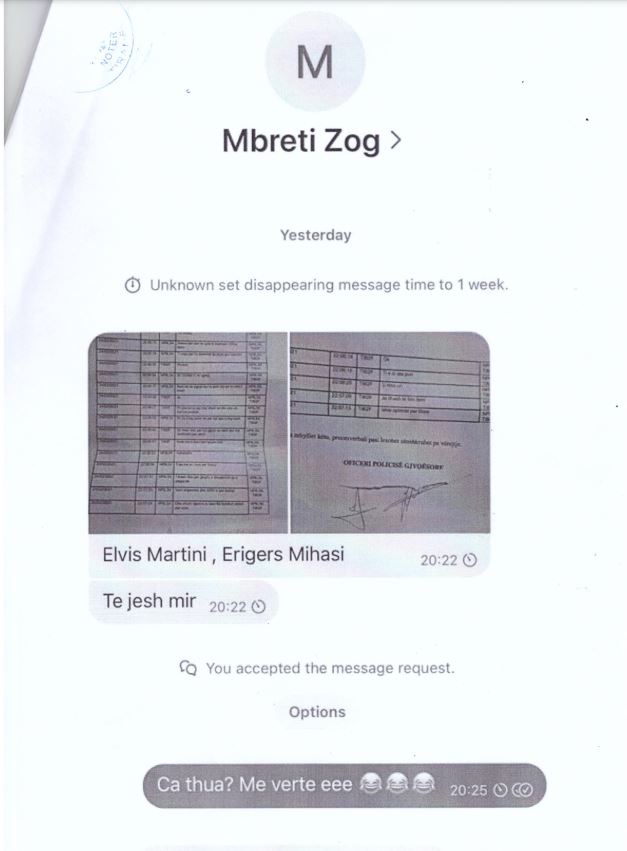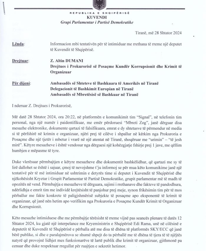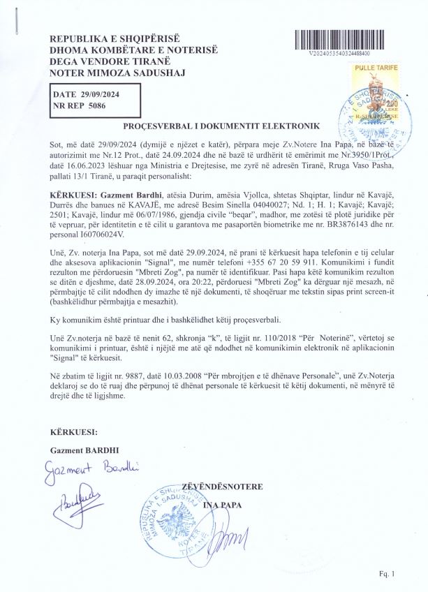 Më datë 28 Shtator 2024, ora 20:22, në platformën e komunikimit tim “Signal”, në telefonin tim personal, nga një numër i paidentifikuar, me emër përdoruesi “Mbreti Zog”, janë dërguar disa mesazhe elektronike, dokumente qartazi të falsifikuara, emrat e dy shtetasve të përmendur në media si të përfshirë në krimin e organizuar, njëri prej të cilëve i shpallur në kërkim nga Prokuroria e Posaçme dhe një tjetër i mbetur i vrarë në një atentat në Tiranë, shoqëruar me “urimin” – “të jesh mirë”. Këtyre mesazheve i është vendosur nga dërguesi një kohëzgjatje fshirje prej 1 jave, me qëllim humbjen e mëpasme të tyre.