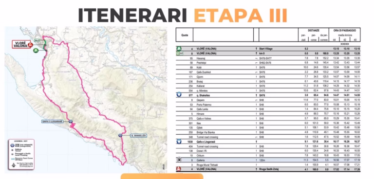 Në kuadër të organizimit të etapës së tretë dhe të fundit të garës ndërkombëtare “Giro d’Italia 2025”, që do të zhvillohet në qytetin e Vlorës, më datë 11.05.2025, informojmë qytetarët mbi kufizimet e mëposhtme: