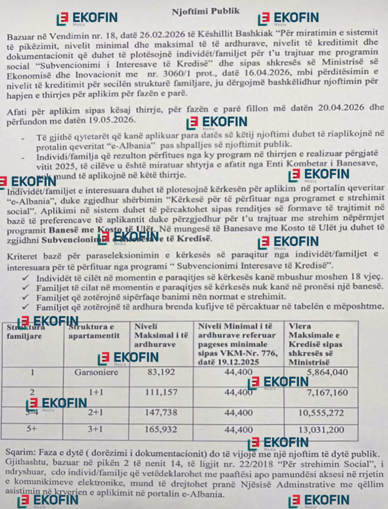 Bashkia Tiranë hap thirrjen për kreditë e buta për vitin 2026, duke përcaktuar kriteret, afatet dhe nivelet e të ardhurave për qytetarët që synojnë të përfitojnë nga skemat e strehimit social.Sipas njoftimit që disponon ekofin.al, bazuar në vendimin nr. 18, datë 26.02.2026 të Këshillit Bashkiak dhe shkresës së Ministrisë së Ekonomisë dhe Inovacionit nr. 3060/1 prot., datë 16.04.2026, është bërë përditësimi i niveleve të kreditimit për çdo strukturë familjare dhe është hapur thirrja për aplikim për fazën e parë.