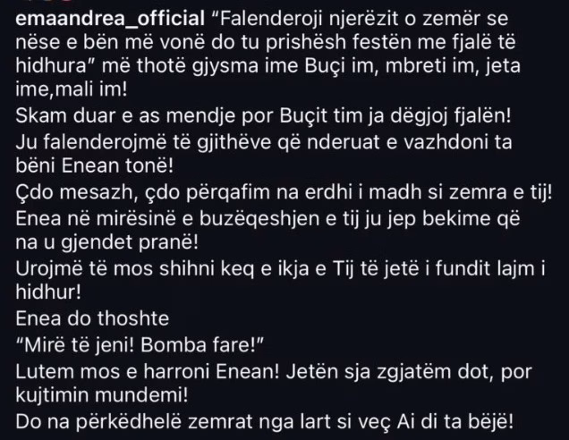 Në mesazhin e saj, Andrea thekson se çdo fjalë ngushëlluese dhe çdo përqafim ka pasur peshën e një zemre të madhe, ashtu siç ishte edhe vetë Enea. Ajo shpreh mirënjohje për mbështetjen e vazhdueshme të publikut, duke e konsideruar solidaritetin si një burim force për familjen në këtë moment të vështirë.