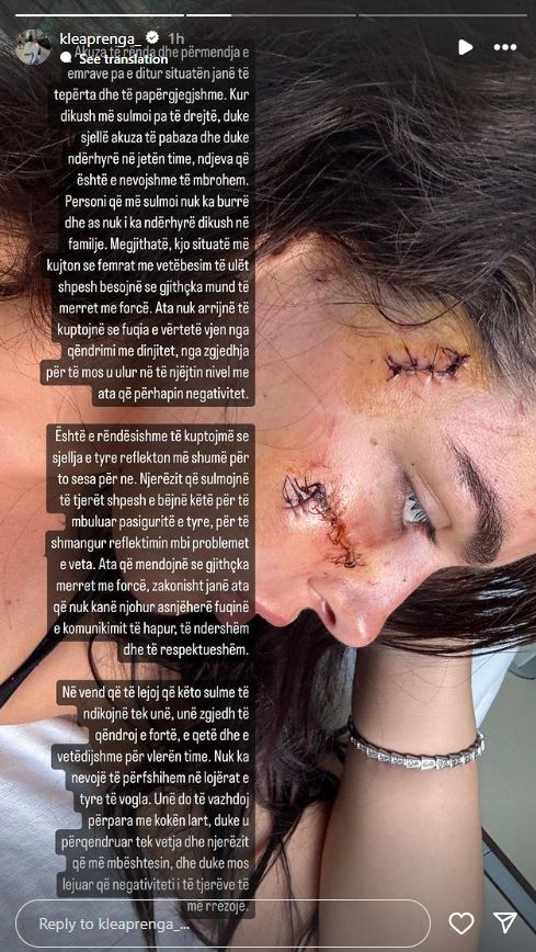 “Akuza të rënda dhe përmendje e emrave pa e ditur situatën janë të tepërta dhe të papërgjegjshme. Kur dikush më sulmoi pa të drejtë, duke sjellë akuza të pabaza dhe duke ndërhyrë në jetën time, ndjeva që është e nevojshme të mbrohem. Personi që më sulmoi nuk ka burrë dhe as nuk i ka ndërhyrë dikush në familje. Megjithatë, kjo situatë më kujton se femrat me vetëbesim të ulët shpesh besojnë se gjithçka mund të merret me forcë. Ata nuk arrijnë të kuptojnë se fuqia e vërtetë vjen nga qëndrimi me dinjitet, nga zgjidhja për të mos u ulur në të njëjtin nivel me ata që përhapin negativitet. Është e rëndësishme të kuptojmë se sjellja e tyre reflektim më shumë për to sesa për ne. Njerëzit që sulmojnë të tjerët shpesh e bëjnë këtë për të mbuluar pasiguritë e tyre, për të shmangur reflektimin mbi problemet e veta. Ata që mendojnë se gjithçka merret me forcë, zakonisht janë ata që nuk kanë njohur asnjëherë fuqinë e komunikimit të hapur, të ndershëm dhe të respektueshëm. Në vend që të lejoj këto sulme të ndikojnë tek unë, unë zgjedh të qëndroj e fortë, e qetë dhe e vetëdijshme për vlerën time. Nuk ka nevojë të përfshihem në lojërat e tyre të vogla. Unë do të vazhdoj përpara me kokën lart, duke u përqendruar tek vetja dhe njerëzit që më mbështesin, dhe duke mos lejuar që negativiteti i të tjerëve të më rrëzojë.”- shkruan Prenga mbi foton ku shfaqet me plagët e qepura në fytyrë.