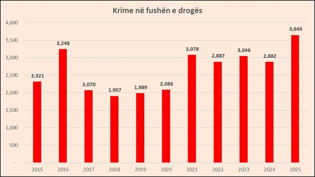 Ky është niveli më i lartë që është regjistruar ndonjëherë, të paktën që nga viti 2015, kur INSTAT publikon të dhënat. Madje krimet në fushën e drogës në 2025-n ishin më të larta edhe se në 2016-n, kur shënohej rekordi i deritanishëm prej 3,248 procedimesh dhe përkoi me periudhën kur në vend lulëzoi kultivimi i kanabisit.