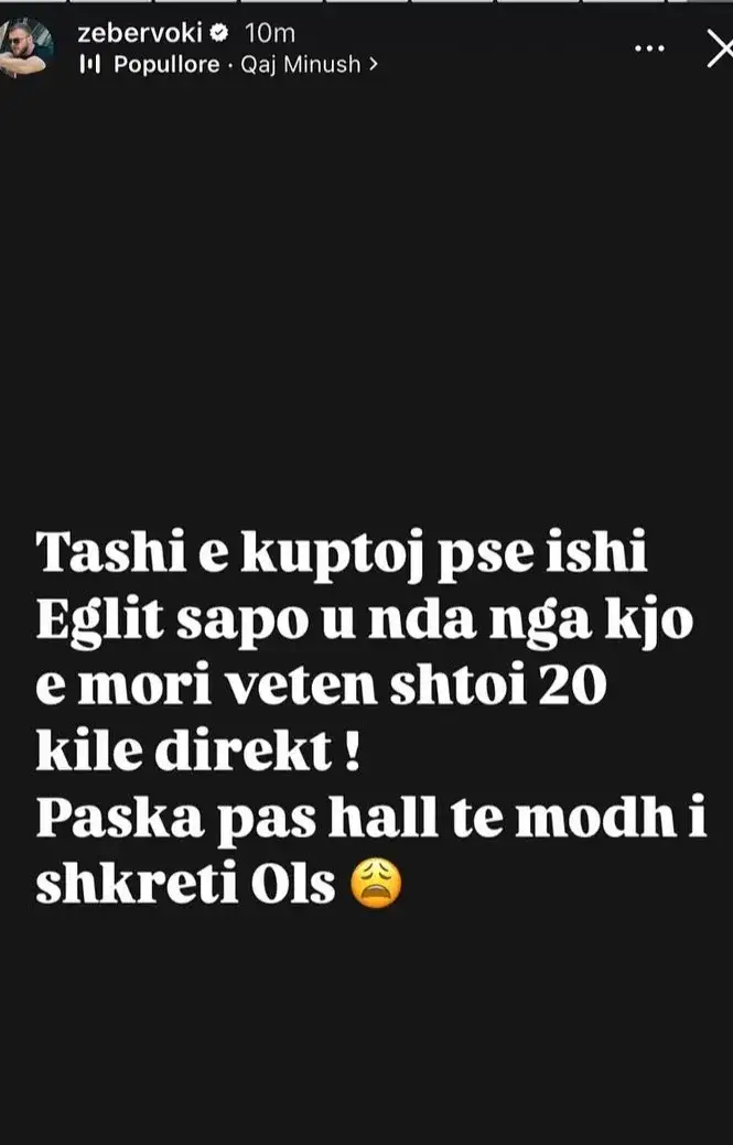 Së fundmi Zebërvoki nëpërmjet disa postimeve të bëra në Instastory komentoi situatën më të fundit të dy banorëve, momentin kur Egli i kërkon falje në gjunjë Gjestit.