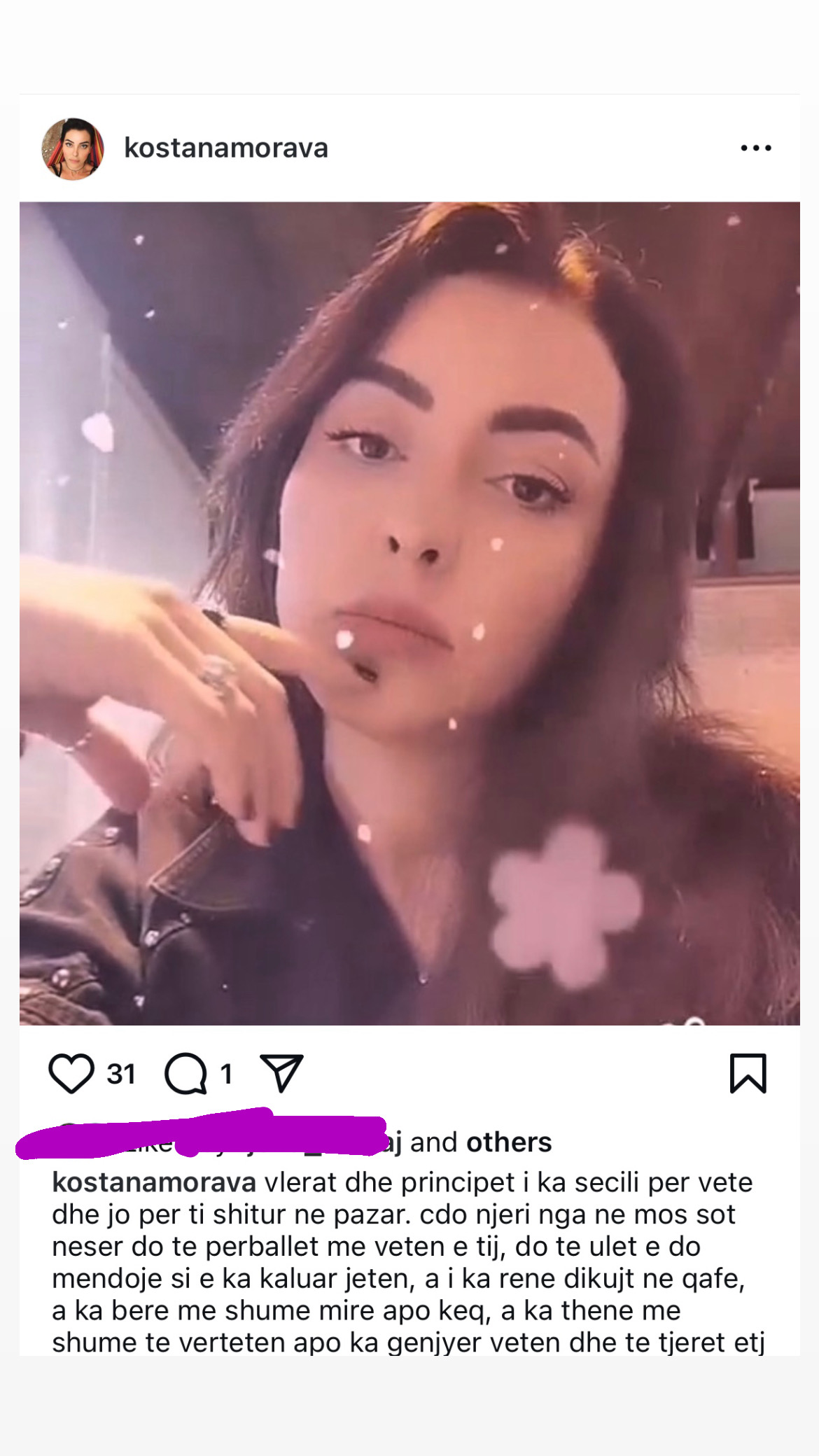 Përmes një postimi në Instagram ajo shprehet se vlerat dhe principet i ka secili për vete dhe jo për t’i shitur në pazar. Ndërsa shton se në mos sot, nesër do të përballet me veten e tij, do të ulet e do mendojë si e ka kaluar jetën, a i ka rënë dikujt në qafe, a ka bërë më shumë mirë apo keq.