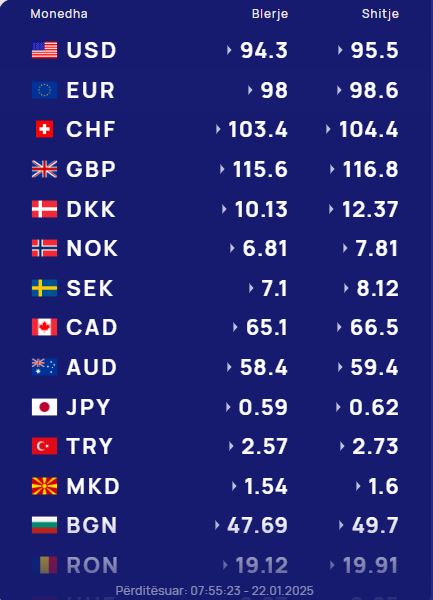 Ndërkohë monedha evropiane euro do blihet me 98 lekë dhe do shitet me 98.6 lekë.