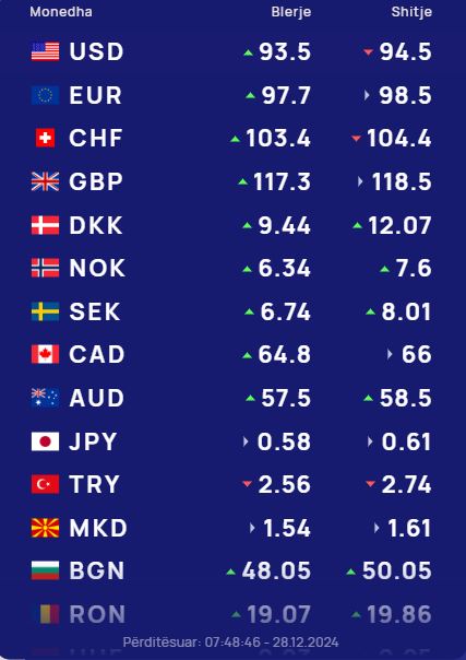Ndërkohë monedha evropiane euro do blihet me 97.7 lekë dhe do shitet me 98.5 lekë.