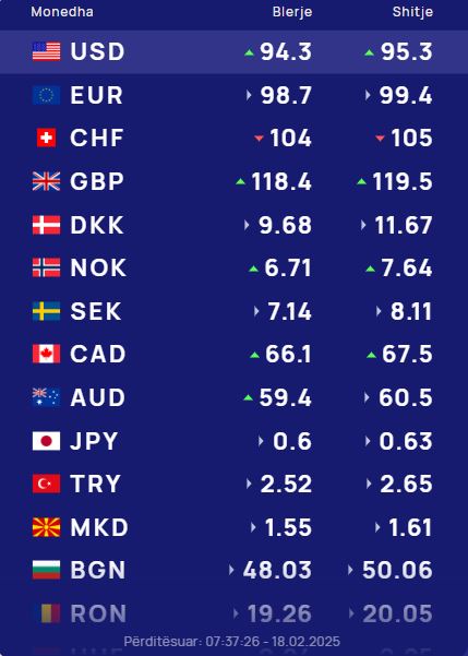 Ndërkohë monedha evropiane euro do blihet me 98.7 lekë dhe do shitet me 99.4 lekë.
