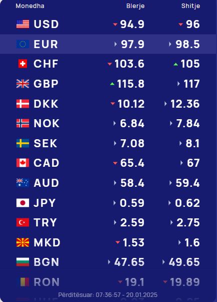 Këmbimi valutor për ditën e sotme, 20 Janar 2025