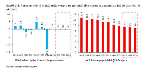 “Në përputhje me parashikimet afatmesme të rritjes, punësimi pritet të rritet me një mesatare prej rreth 0.1% në vit gjatë viteve 2026-2028”, thuhet në Kuadrin e ri makroekonomik.