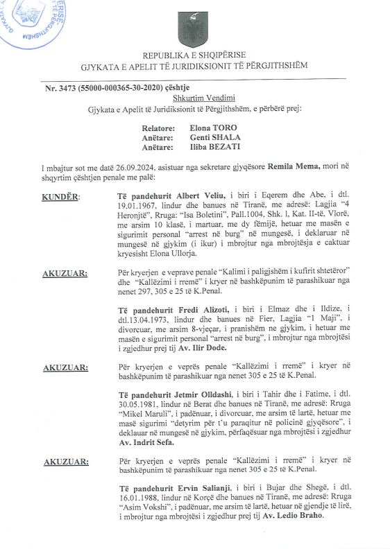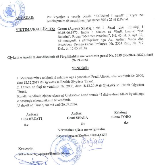TIRANË– Është zbardhur vendimi i Gjykatës së Apelit, ku një ditën e djeshme la në fuqi vendimin e Shkallës së Parë për dënimin me një vit burg të Ervin Salianjit.