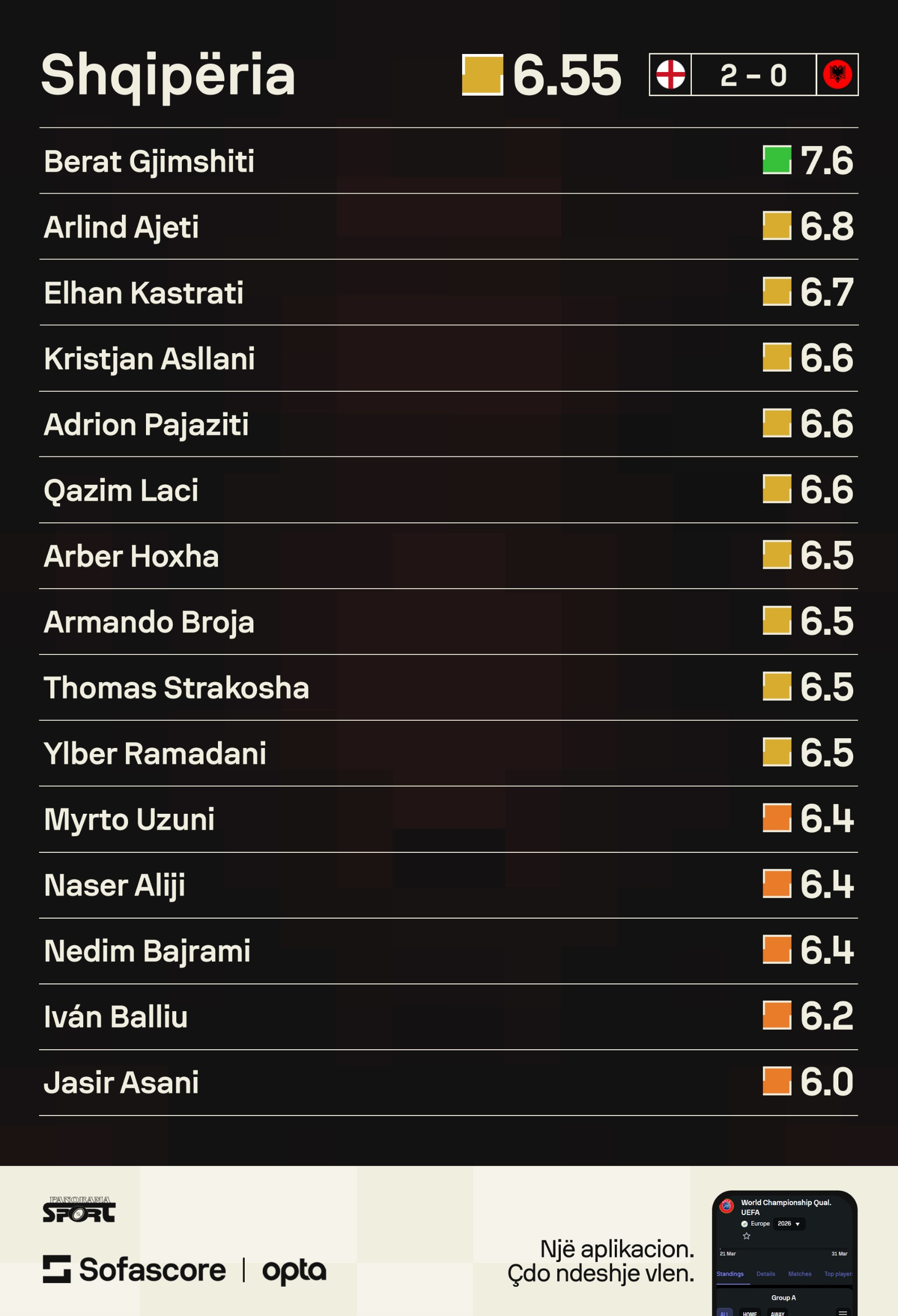 Ndërsa me notën më të ulët në Kombëtaren shqiptare u vlerësua Jasir Asani me 6.0, i cili nuk ishte aspak në mbrëmjen e tij më të mirë. Ndërsa Ivan Balliu ishte i dyti më i dobëti me notën 6.2./PanoramaSport