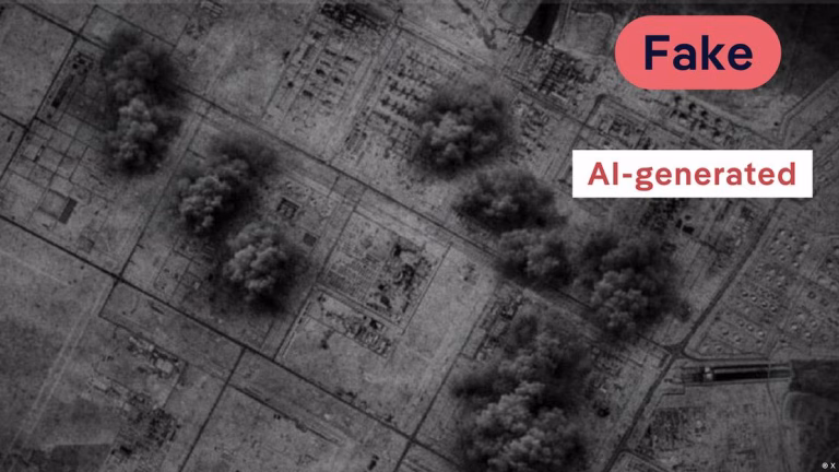 Gazeta iraniane Tehran Times shpërndau imazhe satelitore që pretendonin të tregonin shkatërrimin e një radari amerikan në Katar. Analiza tregoi dy mashtrime: Së pari, vendndodhja e vërtetë ishte një bazë në Bahrein (e cila vërtet ishte sulmuar, por jo në atë shkallë vizuale). Së dyti, ndërsa fotoja “para” ishte një pamje e vërtetë e Google Earth e vitit 2025, fotoja “pas” ishte tërësisht e gjeneruar nga IA, me struktura ndërtesash që ndryshonin formë në mënyrë të palogjikshme dhe mbeturina të klonuara.