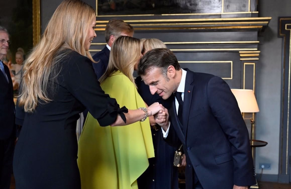 Ndërkohë Presidenti francez Emmanuel Macron përshëndeti Mbretëreshën Máxima dhe princeshën Amalia me një gjest të vjetër, një puthje në dorë.