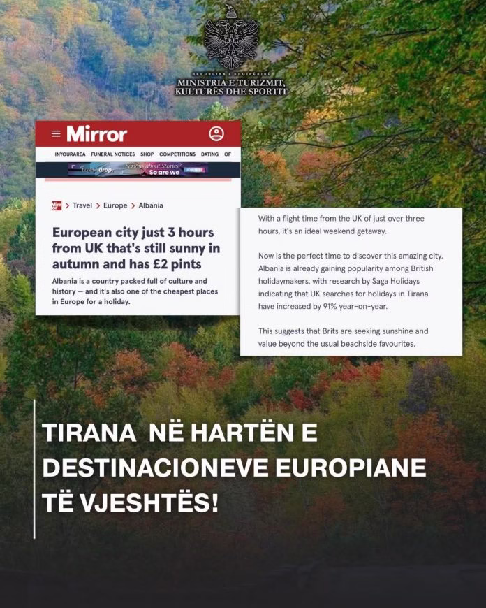Sipas Mirror, kërkimet për udhëtime në Tiranë janë rritur me 91% krahasuar me një vit më parë, ndërsa kryeqyteti shqiptar po renditet ndër destinacionet më tërheqëse dhe më të përballueshme për një arratisje kulturore këtë vjeshtë.