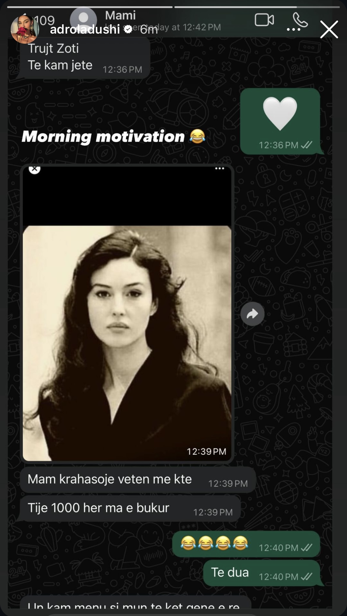 TIRANË– Adrola Dushi sot përmes një postimi në InstaStory ka publikuar një bisedë me të ëmën.