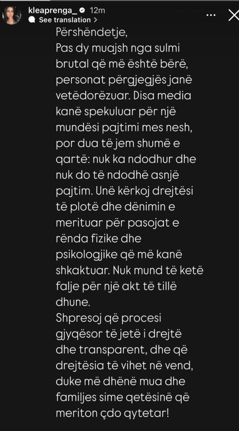 “Përshëndetje! Pas dy muajsh nga sulmi brutal që më është bërë, personat përgjegjës janë vetëdorëzuar. Disa media kanë spekuluar për një mundësi pajtimi mes nesh, por dua të jem e qartë: Nuk ka ndodhur dhe nuk do të ndodhë asnjë pajtim. Unë kërkoj drejtësi të plotë dhe dënimin e merituar për pasojat e rënda fizike dhe psikologjike që më kanë shkaktuar. Nuk mund të ketë falje për një akt të tillë dhune. Shpresoj që procesi gjyqësor të jetë i drejtë, transparent dhe që drejtësia të vihet në vend, duke më dhënë mua dhe familjes sime qetësinë që meriton çdo qytetar!”.