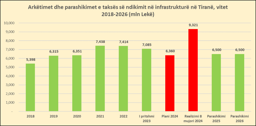Realizmi i të ardhurave tejkalon dyfishin e planit të miratuar nga bashkia e Tiranës për 8 mujorin nga taksa e ndikimit në infrastrukturë, teksa plani fillestar për 8 mujorin ishte 4.2 miliardë lekë. Teksa për gjithë vitin 2024 pritej të arkëtoheshin rreth 6.4 miliardë lekë nga taksa e ndikimit në infrastrukturë, vetëm për 8 mujorin janë mbledhur 47% më shumë.