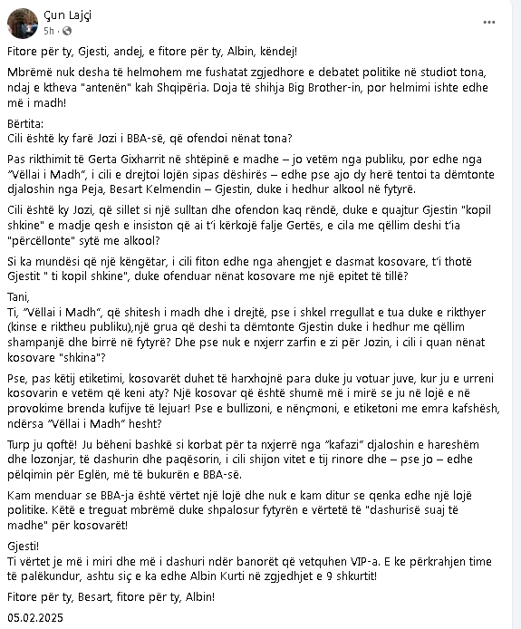 Ti, “Vëllai i Madh”, që shitesh i madh dhe i drejtë, pse i shkel rregullat e tua duke e rikthyer (kinse e riktheu publiku),një grua që deshi ta dëmtonte Gjestin duke i hedhur me qëllim shampanjë dhe birrë në fytyrë? Dhe pse nuk e nxjerr zarfin e zi për Jozin, i cili i quan nënat kosovare “shkina”?