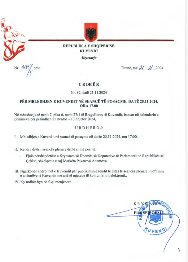 Gjatë seancës pritet të mbajë fjalën përshëndetëse në Kuvendin e Shqipërisë, Kryetarja e Dhomës së Deputetëve të Parlamentit të Republikës së Çekisë, Shkëlqesia e Saj Markéta Pekarová Adamová.