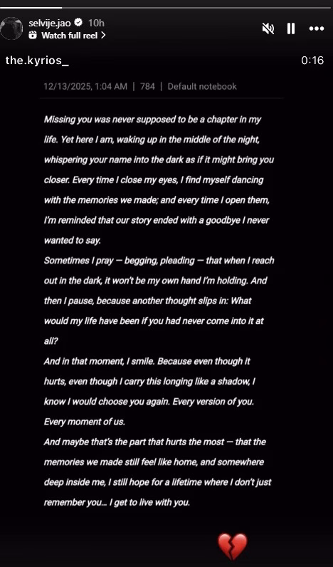 Ndërsa emri i tij nuk përmendet drejtpërdrejt, ndjekësit e kanë lidhur menjëherë postimin me ndarjen e tij nga jeta, dhe mesazhi është shoqëruar me simbolin e zemrës së thyer, duke theksuar dhimbjen dhe dashurinë e pashuar.