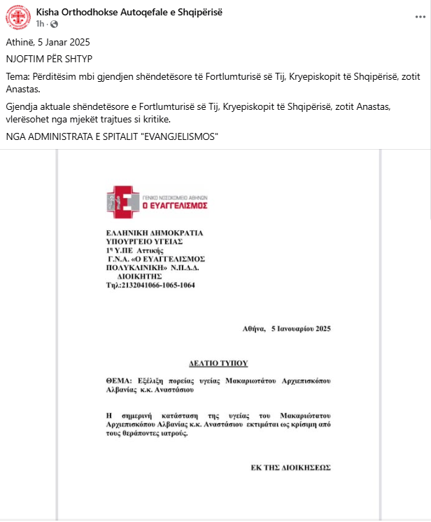 Përmes një reagimi zyrtar Kisha bën me dije se, Fortlumturia e Tij, Kryepiskopi Anastas ndodhet në gjendje kritike dhe po ndiqet nga mjekët specialistë në spitalin “Ungjillëzimi” Athinë.
