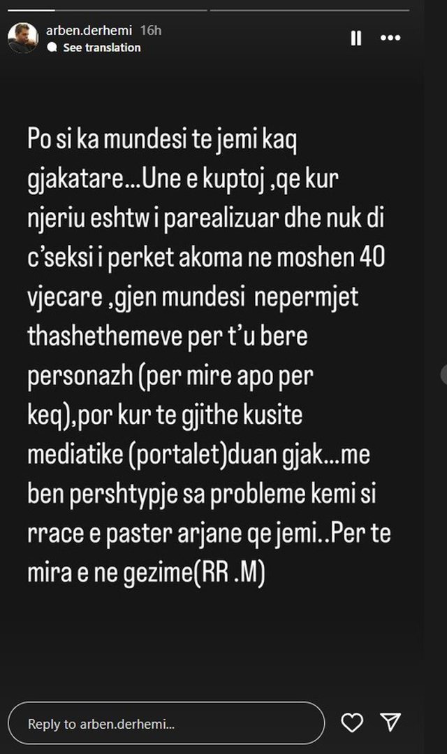 “Po si ka mundësi të jemi kaq gjakatarë…Unë e kuptoj që kur njeriu është i parealizuar dhe nuk di ç’seksi i përket akoma në moshën 40-vjeçare gjen mundësi nëpërmjet thashethemeve për t’u bërë personazh (për mirë apo për keq), por kur të gjithë kustitë mediatike (portalet) duan gjak…më bën përshtypje sa problem e kemi si racë e pastër arjane që jemi…Për të mira dhe gëzime”, shkruan aktori.