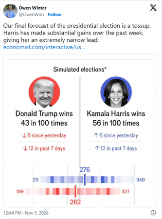 Gjetjet e sondazheve i japin Harris 276, një numër që siguron fitoren e saj pasi kërkohet 270, dhe 262 për Trump.