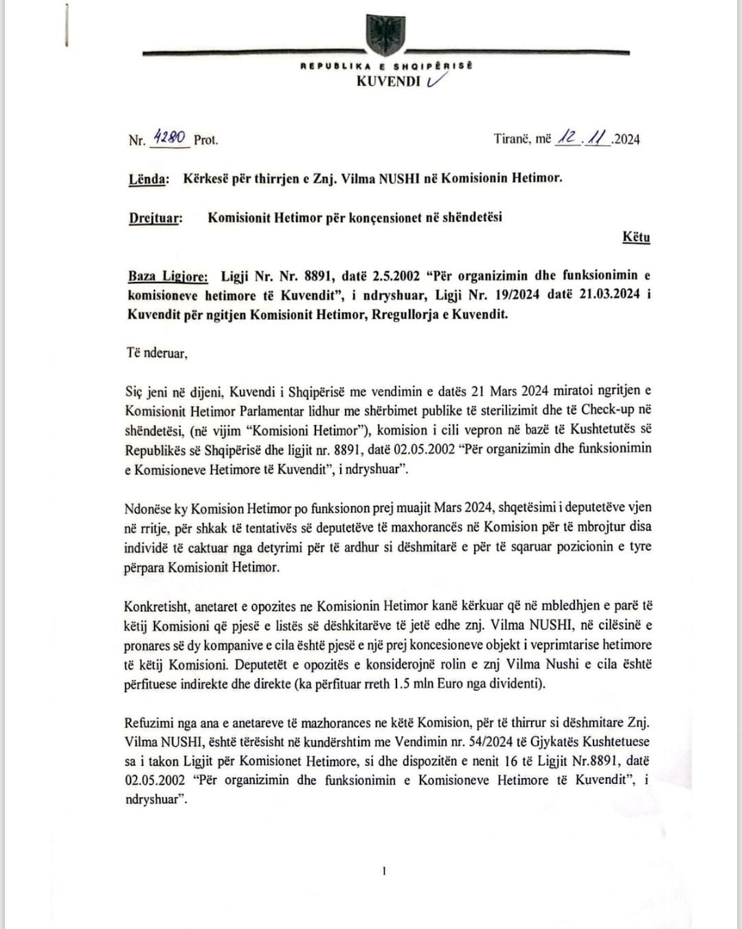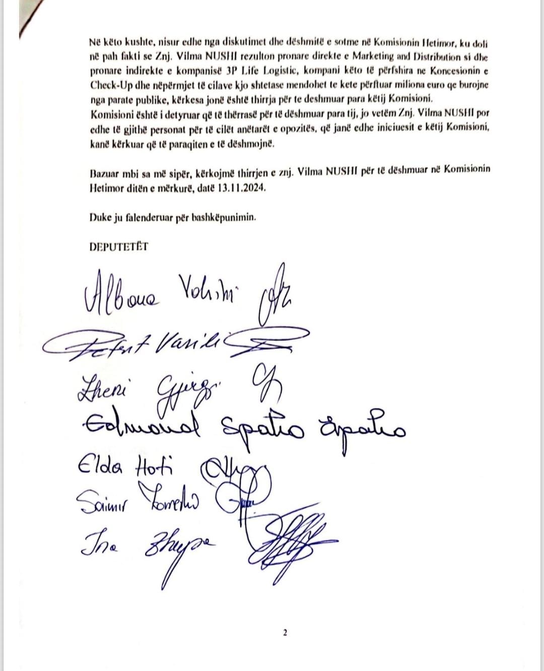 Ky dokument është firmosur nga 7 deputetët e opozitës në komision.