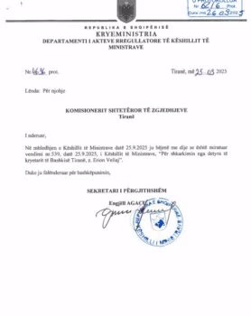 Letra e firmosur nga Sekretari i Përgjithshëm i Kryeministrisë, Engjëll Agaçi është dërguar në datën 25 Shtator.