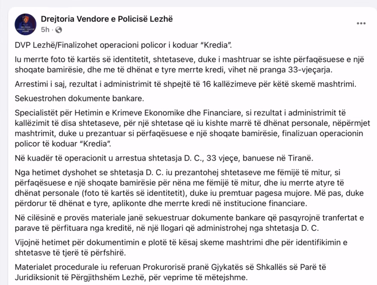 “Nga hetimet dyshohet se shtetasja D. C. iu prezantohej shtetaseve me fëmijë të mitur, si përfaqësuese e një shoqate bamirësie për nëna me fëmijë të mitur, dhe iu merrte atyre të dhënat personale (foto të kartës së identitetit), duke iu premtuar pagesa mujore. Më pas, duke përdorur të dhënat e tyre, aplikonte dhe merrte kredi në institucione financiare”, njoftoi policia.