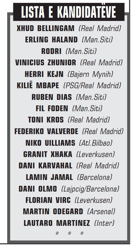 Kandidatë të tjerë potencialë që mund ta rrezikojnë atë janë Bellingam (Real Madrid), Rodri (Mançester Siti) ose Karvahal (Real Madrid).