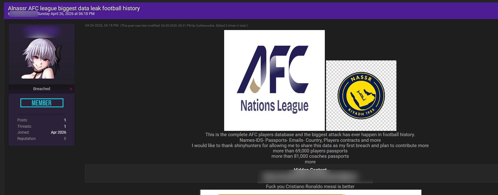 Grupi i njohur si ShinyHunters e ka cilësuar këtë ndërhyrje si “thyerjen më të madhe në historinë e futbollit”, ndërsa ende nuk ka një reagim zyrtar mbi mënyrën se si është realizuar sulmi apo masat e marra për menaxhimin e situatës.